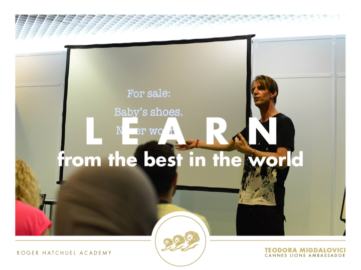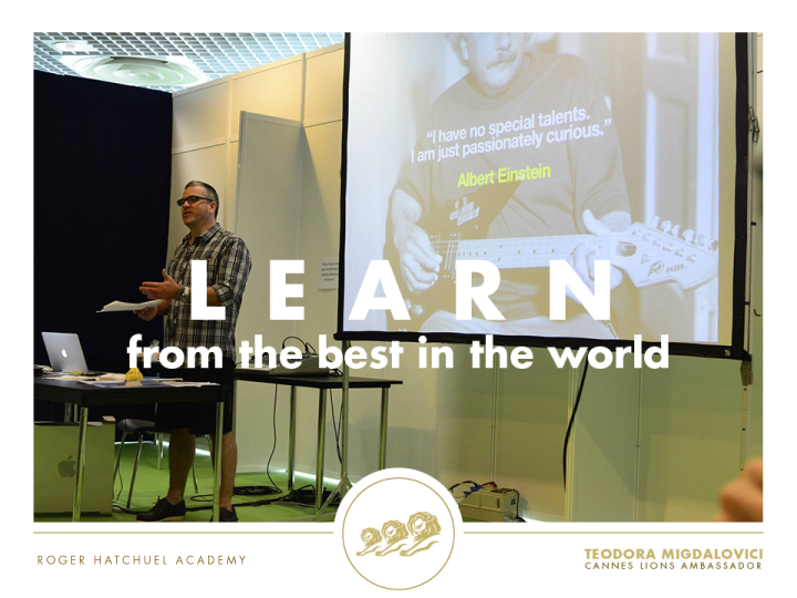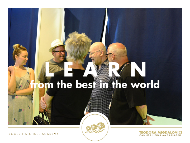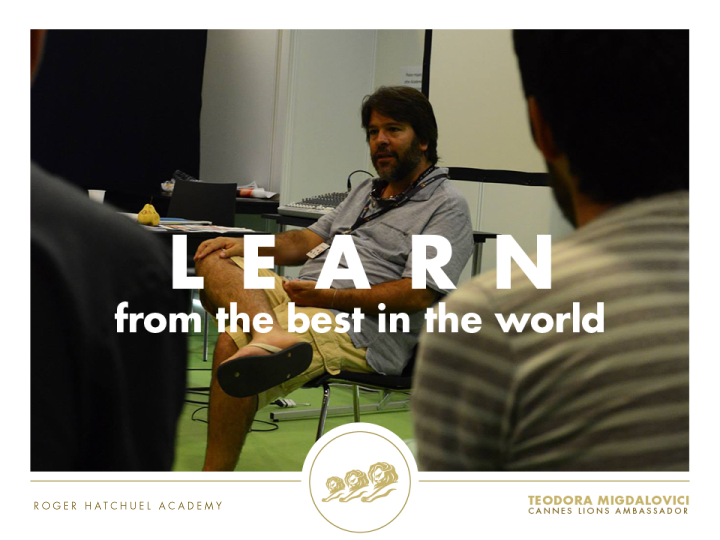 Roger Hatchuel Academy este un prestigios accelerator de cariera pentru tinerii cu varste intre 18 si 23 de ani. Un numar de aproximativ 30 de studenti de nationalitati diferite se reunesc la Cannes Lions, dupa ce, in prealabil, au castigat competitiile locale din tarile de origine. Pe toata durata Cannes Lions, cel mai prestigios festival de gandire creativa la nivel global, ei au sansa sa se intalneasca cu creativi, comunicatori si clienti care deseneaza trendurile in creativitatea globala, sa le puna intrebari si sa rezolve impecabil briefuri la workshopurile adhoc, pe care acestia le pot genera in intalnirile cu cei admisi in academie.