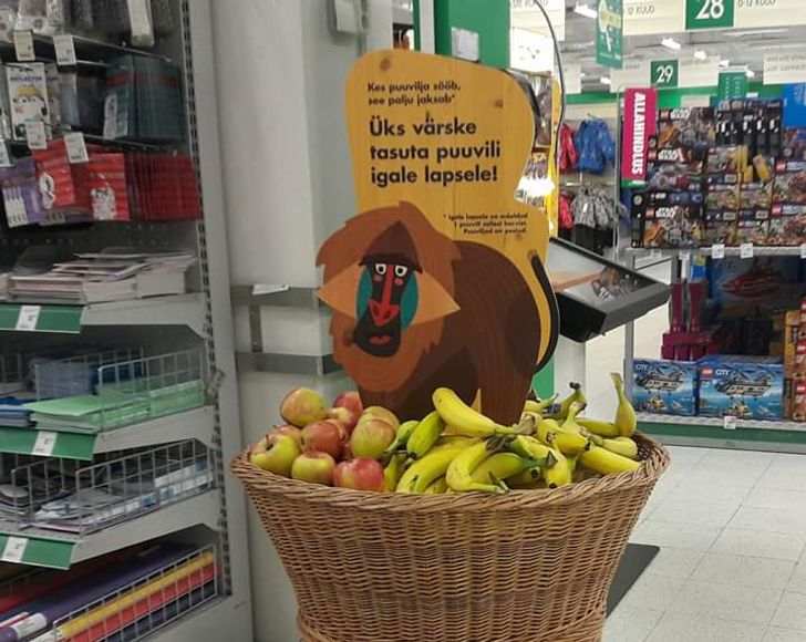 10. Un supermarket din Estonia. Un cos cu fructe proaspete si gratuite pentru copii: „O fructa proaspata pentru fiecare copil”.