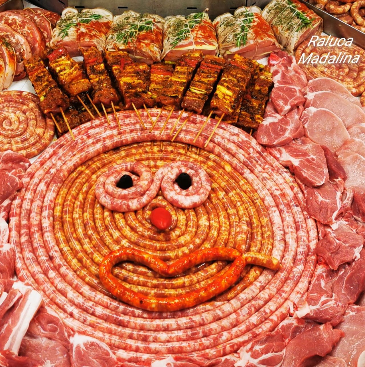 14. In final, iata si fotografii din tara noastra; imaginile infatiseaza vitrina raionului de carne de la un hipermarket francez din Arad, iar… artista (sefa adjuncta a acestui raion) se numeste Raluca Madalina Breban… (sa stiti ca nu o cunosc si nici macar nu stiu cum arata! 😊).